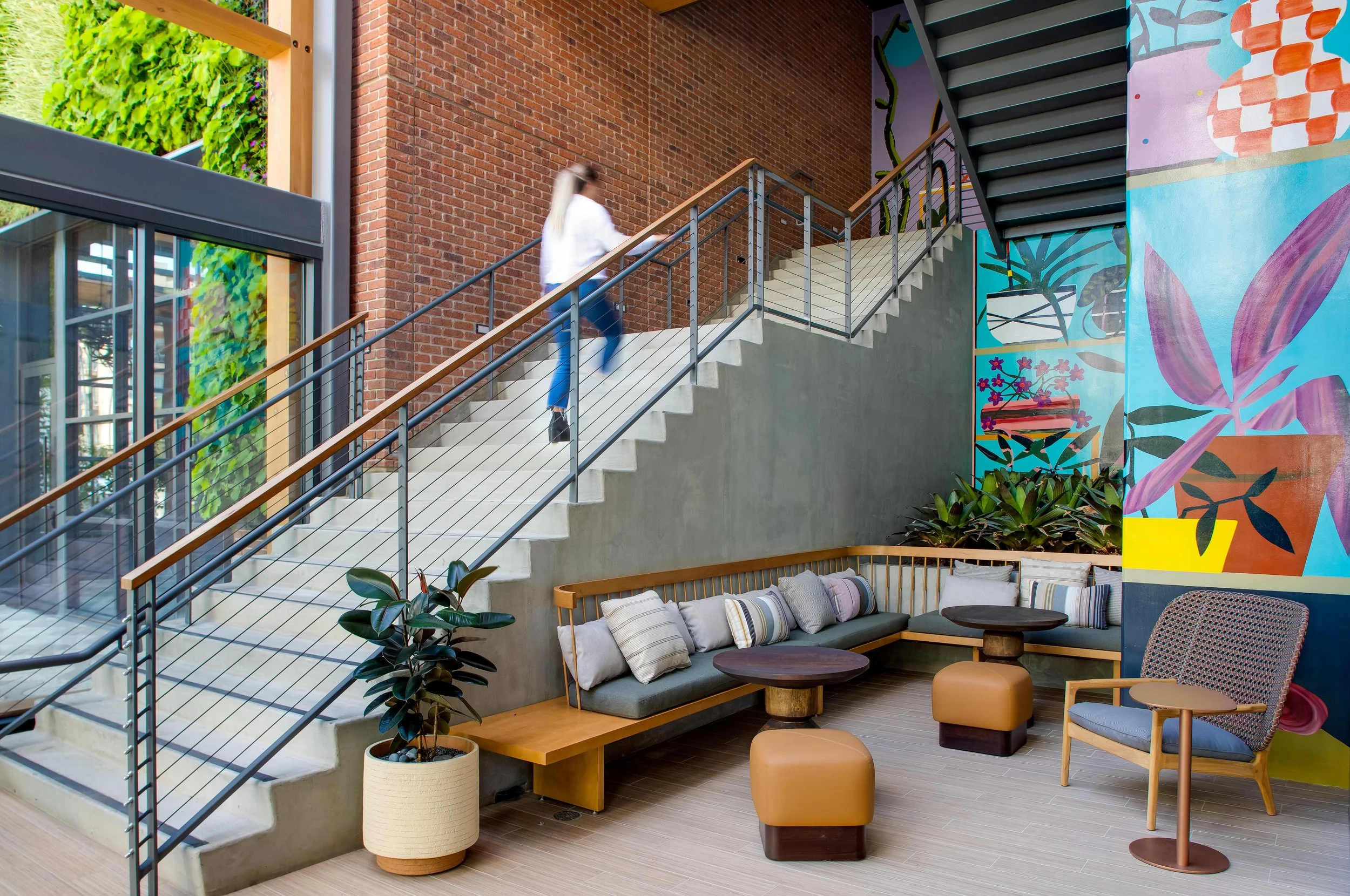 The centerpiece of this open-concept office space is the stunning metal staircase. The colorful mural perfectly contrasts the neutral materials, making it a dream to shoot.